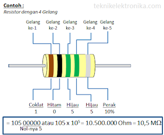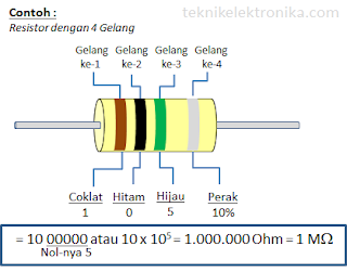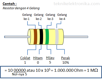 Maka nilai Resistor tersebut adalah 10 * 105 = 1.000.000 Ohm atau 1 MOhm dengan toleransi 10%.