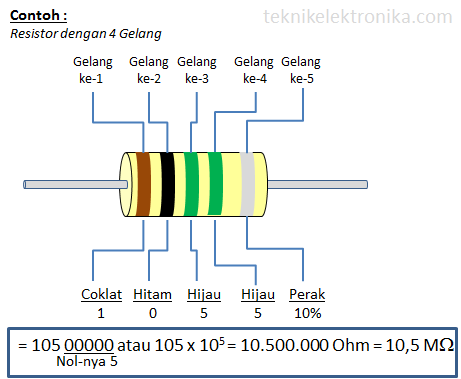Maka nilai Resistor tersebut adalah 105 * 105 = 10.500.000 Ohm atau 10,5 MOhm dengan toleransi 10%.